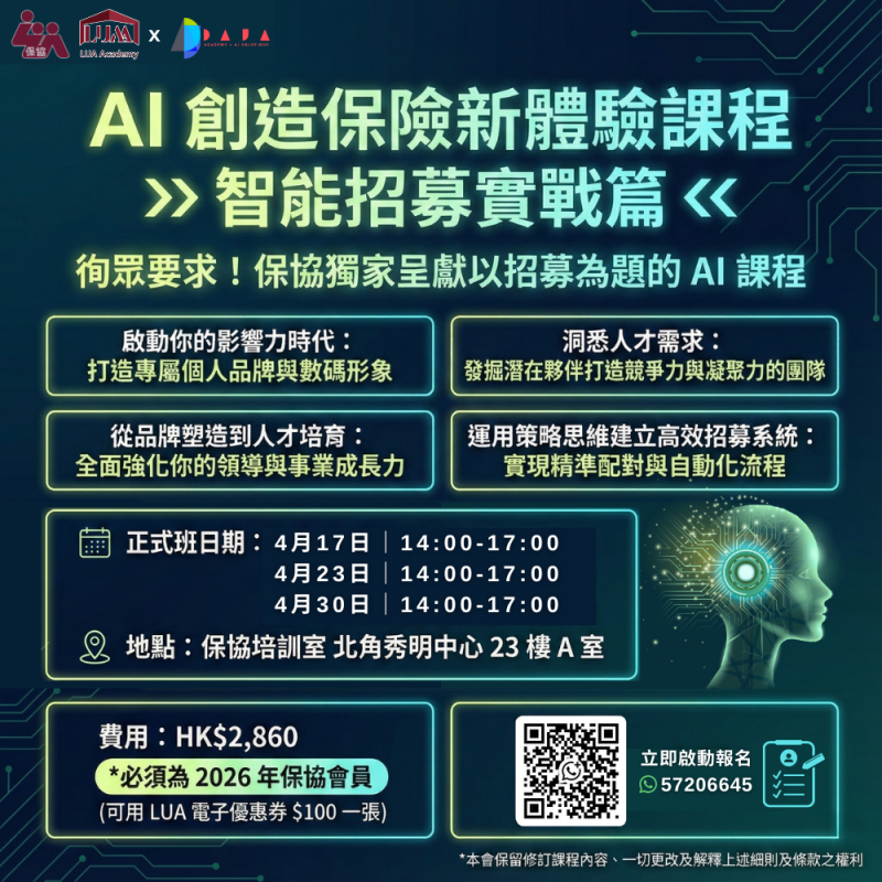 延續「AI創造保險新體驗」,讓您深度駕馭多款實用的AI應用程式,建立高效招募系統,助您強化團隊競爭力﹗