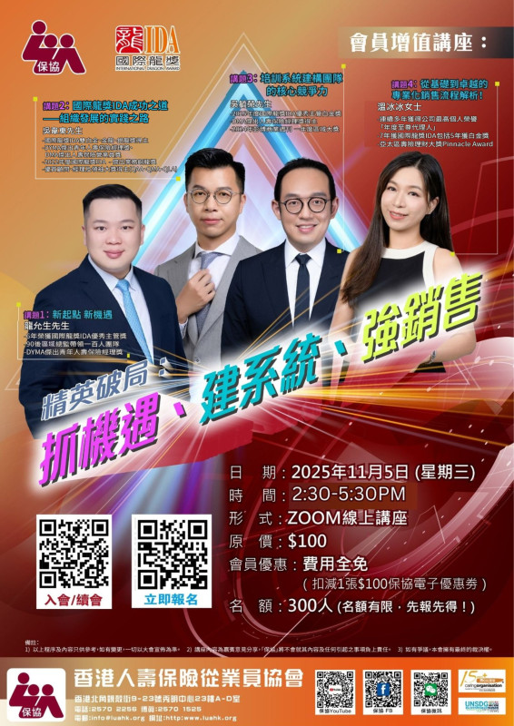講座時間定在11 月 5 日,正好是「年底業績衝刺關鍵期」!「銷售訣竅、團隊管理系統」,直接套用於 Q4 業務 —— 別等明年!四位於本年度國際龍獎 IDA年會分享的香港嘉賓「凱旋歸來」,親自把實戰精髓分享!