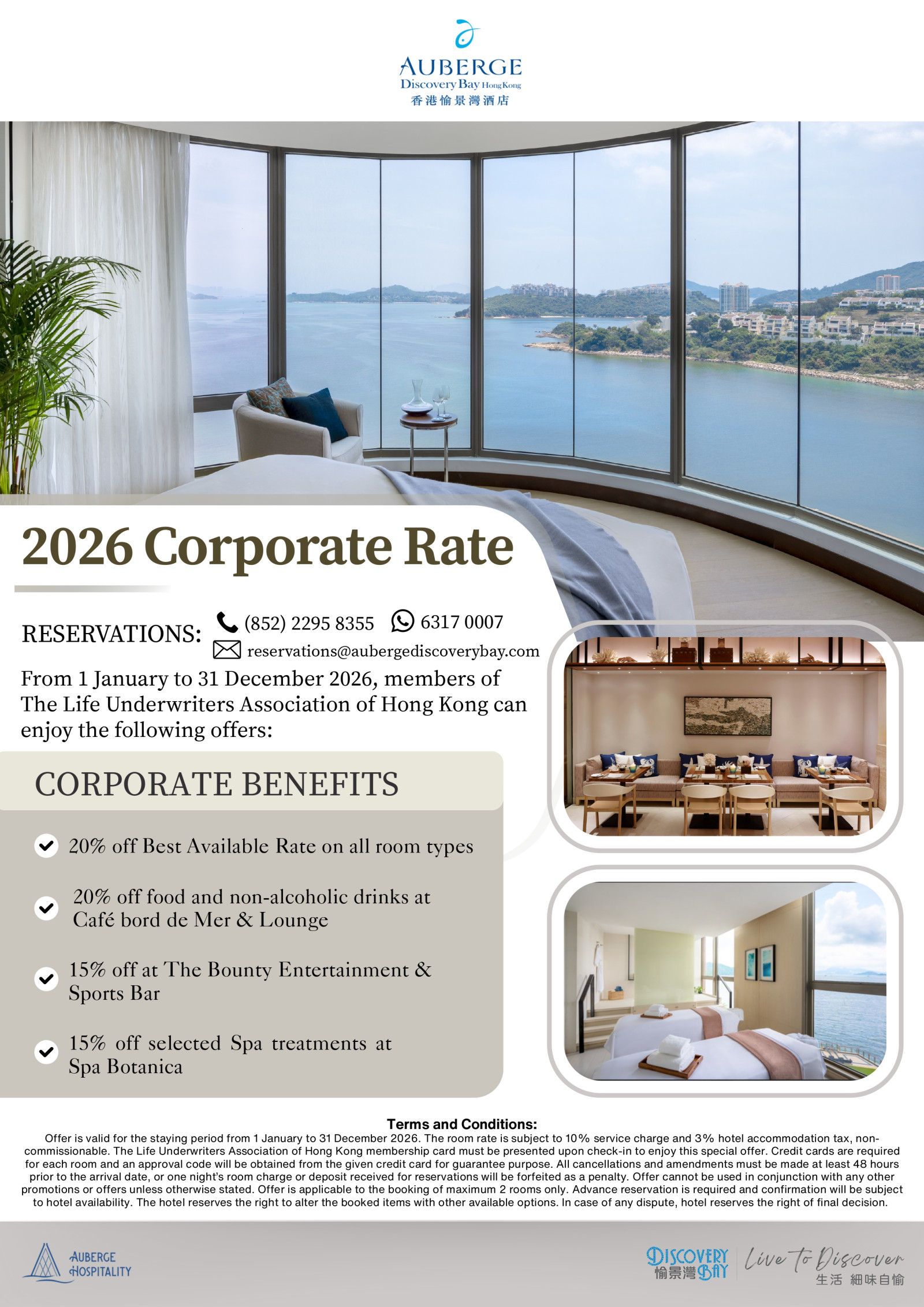 香港人壽保險從業員協會有限公司會員 由2026年1月1日起至12月31日於香港愉景灣酒店尊享以下禮遇