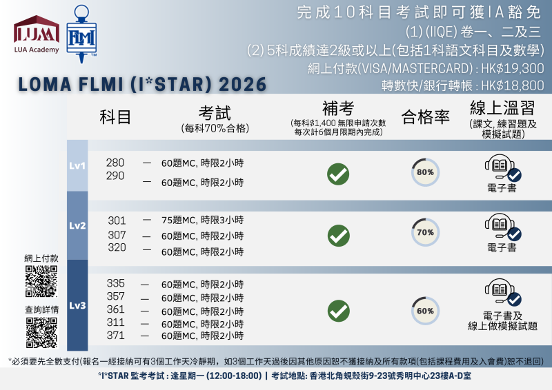 *课程费用包括10 科温习材料(电子书,练习题及模拟试题)(考生经LOMA 官方学习平台下载教材) + 10 科每一科目一次考试机会(监考考试) +上牌申请支援服务