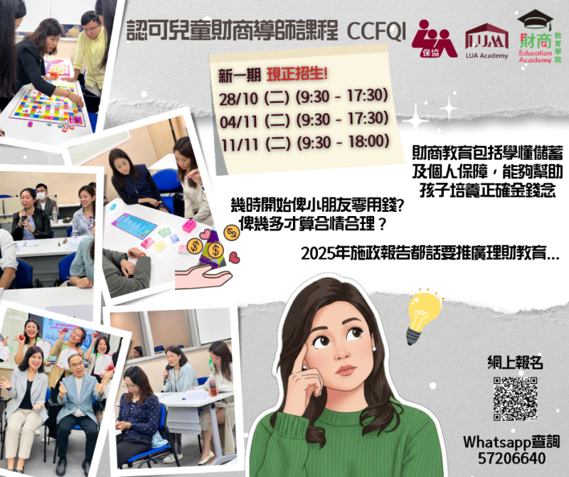 学员出席率须达80%(即只可连续缺席4小时计算),及设计活动计划书并合格后,方可获由财商教育学院颁授「认可儿童财商导师(CCFQI)」课程证书。